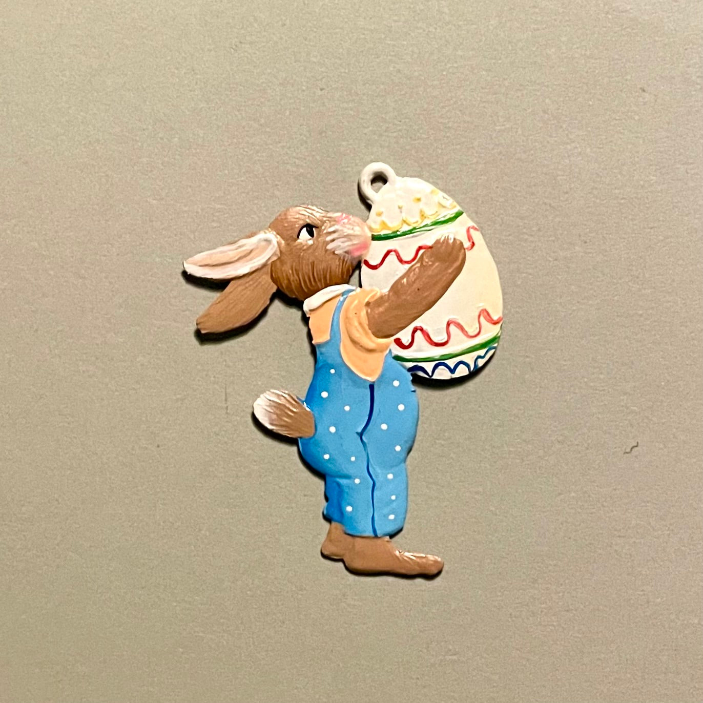 Denne charmerende håndlavede og håndmalede tin figur forestiller en sød påskehare iført lyseblå smækbukser med fine hvide prikker. Haren holder et smukt dekoreret hvidt påskeæg, og de detaljerede håndmalede elementer gør figuren helt særlig og fuld af påskestemning.