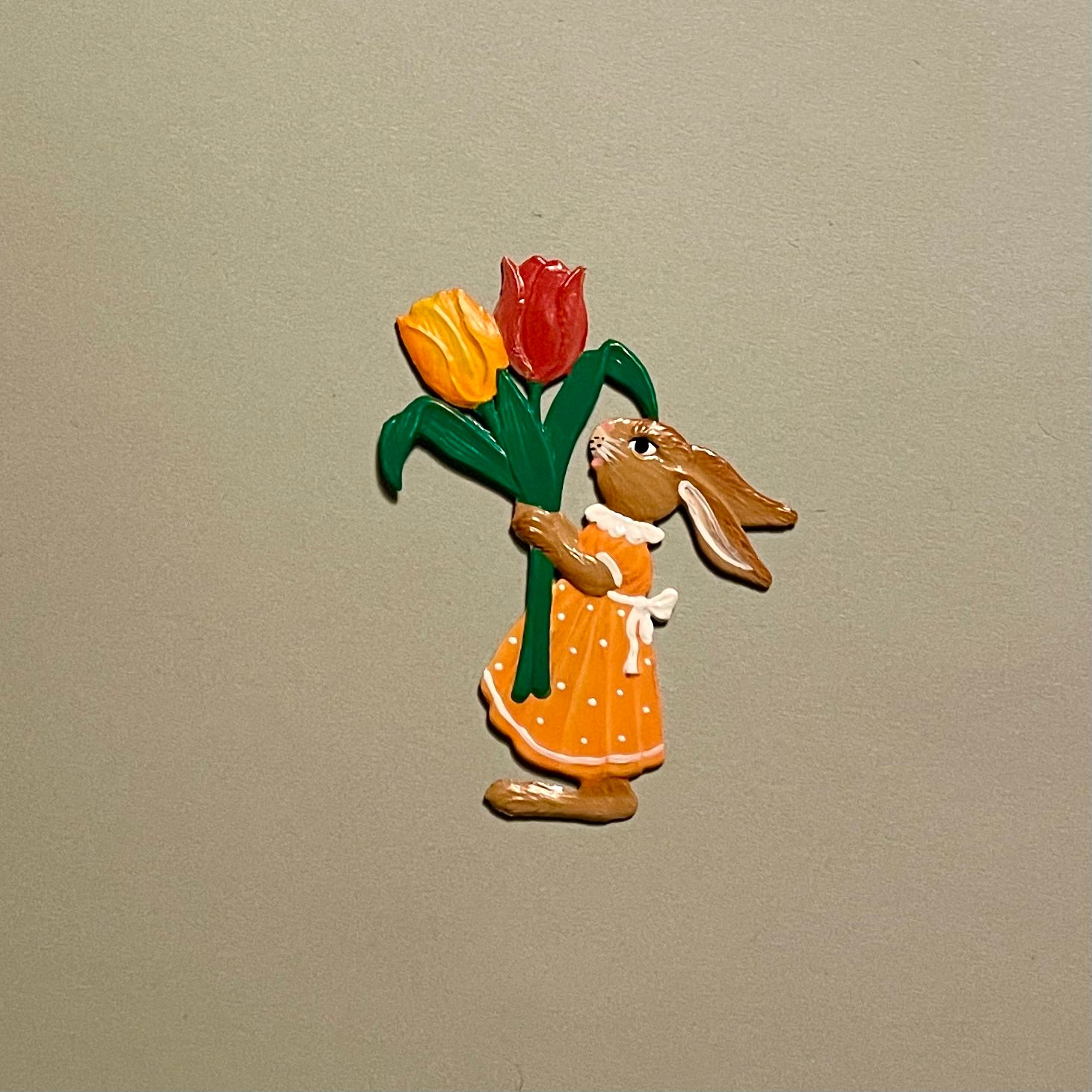 Denne søde og charmerende håndlavede og håndmalede tinfigur forestiller en lille påskehare iført en orange kjole med hvide prikker. Haren holder to smukke tulipaner i røde og gule nuancer, som giver figuren et varmt og forårsfriskt udtryk.