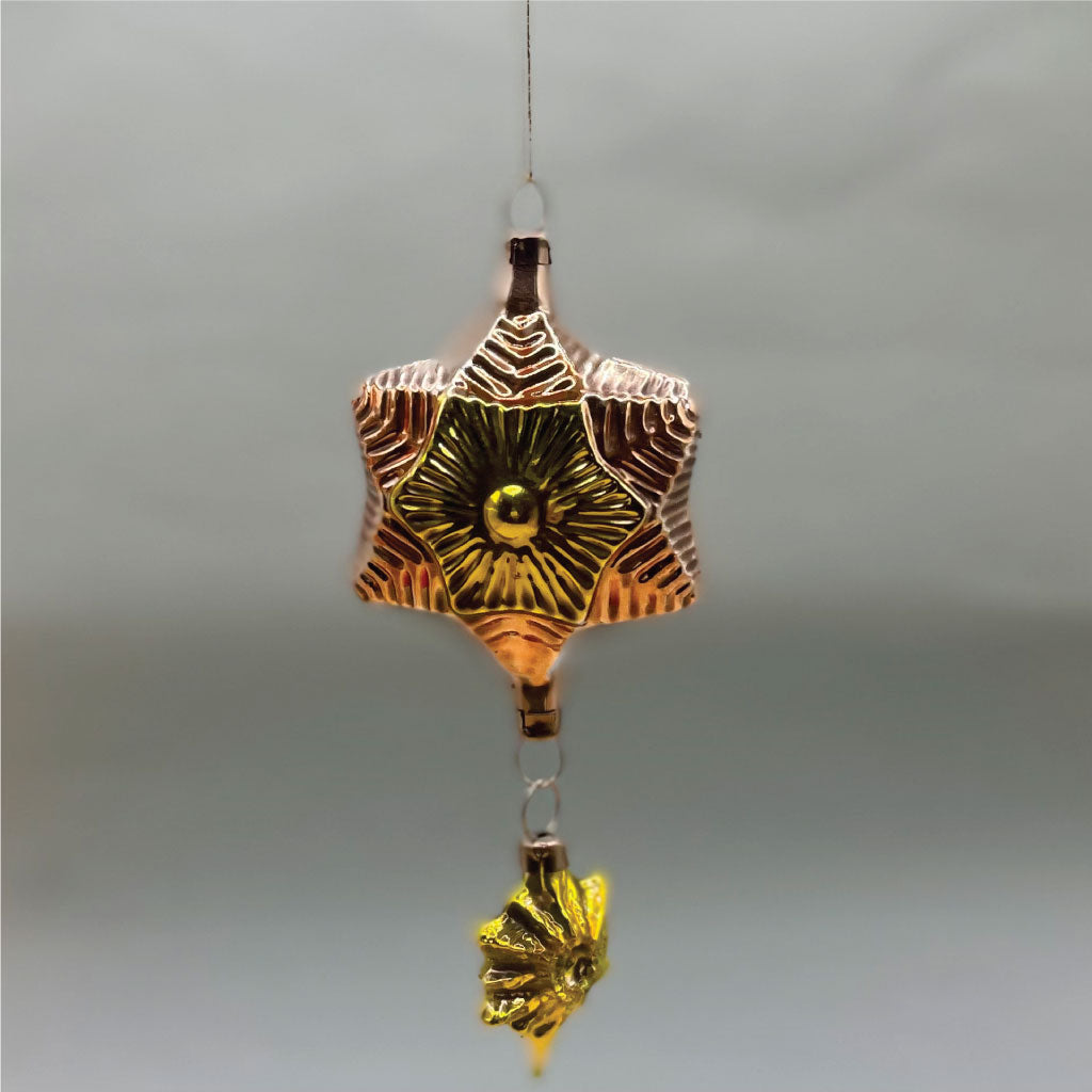 Denne smukke, håndlavede stjerne i glas er en fantastisk tilføjelse til dit julepynt. Den har en lille stjerne som vedhæng, hvilket giver den et ekstra strejf af magi og elegance. Med sin fine detaljering og omhyggelige håndværk bringer denne dekoration en nostalgisk og klassisk følelse til dit hjem.