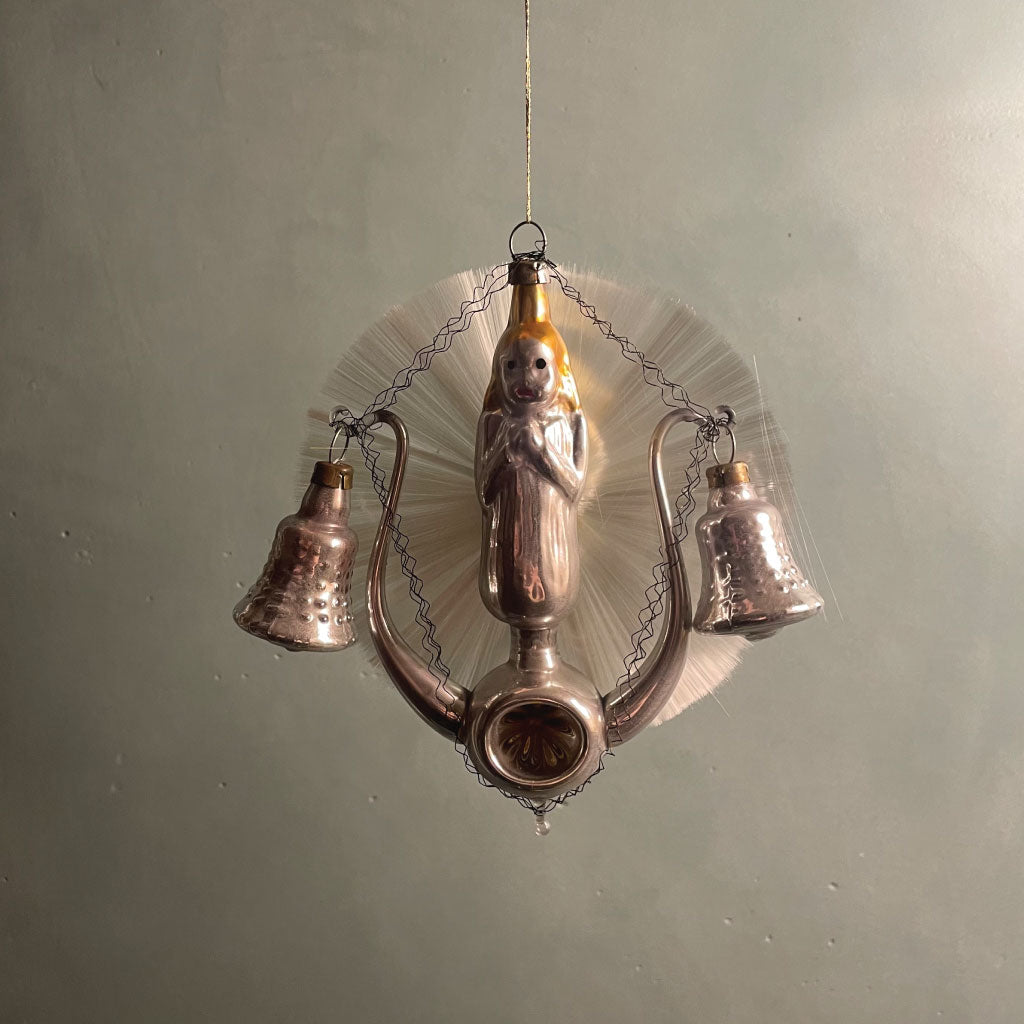 Denne smukke, håndlavede engel med klokker er en betagende juledekoration, der udstråler både elegance og festlighed. Englen, der er prydet med fine detaljer og klokkens klirrende lyd, bringer en nostalgisk og magisk stemning til dit hjem. Perfekt som en central figur på juletræet eller som en del af din juleudsmykning.