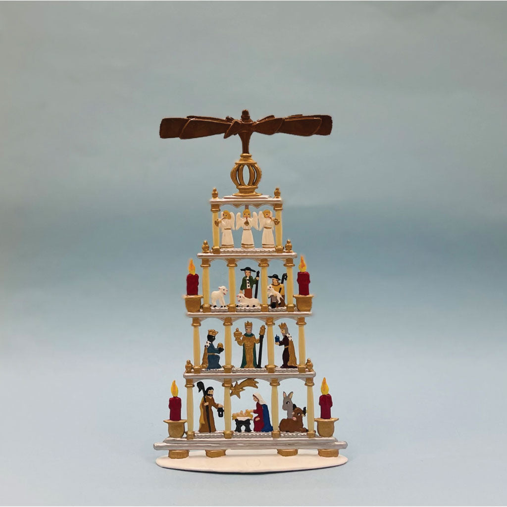 Denne elegante julepyramide i tin er en smuk tilføjelse til dit hjem i juletiden. Perfekt til at have stående fremme eller som en del af dit julebord. Håndlavet og håndmalet, hvilket gør hver enkelt unik – små variationer fra det viste foto kan forekomme.