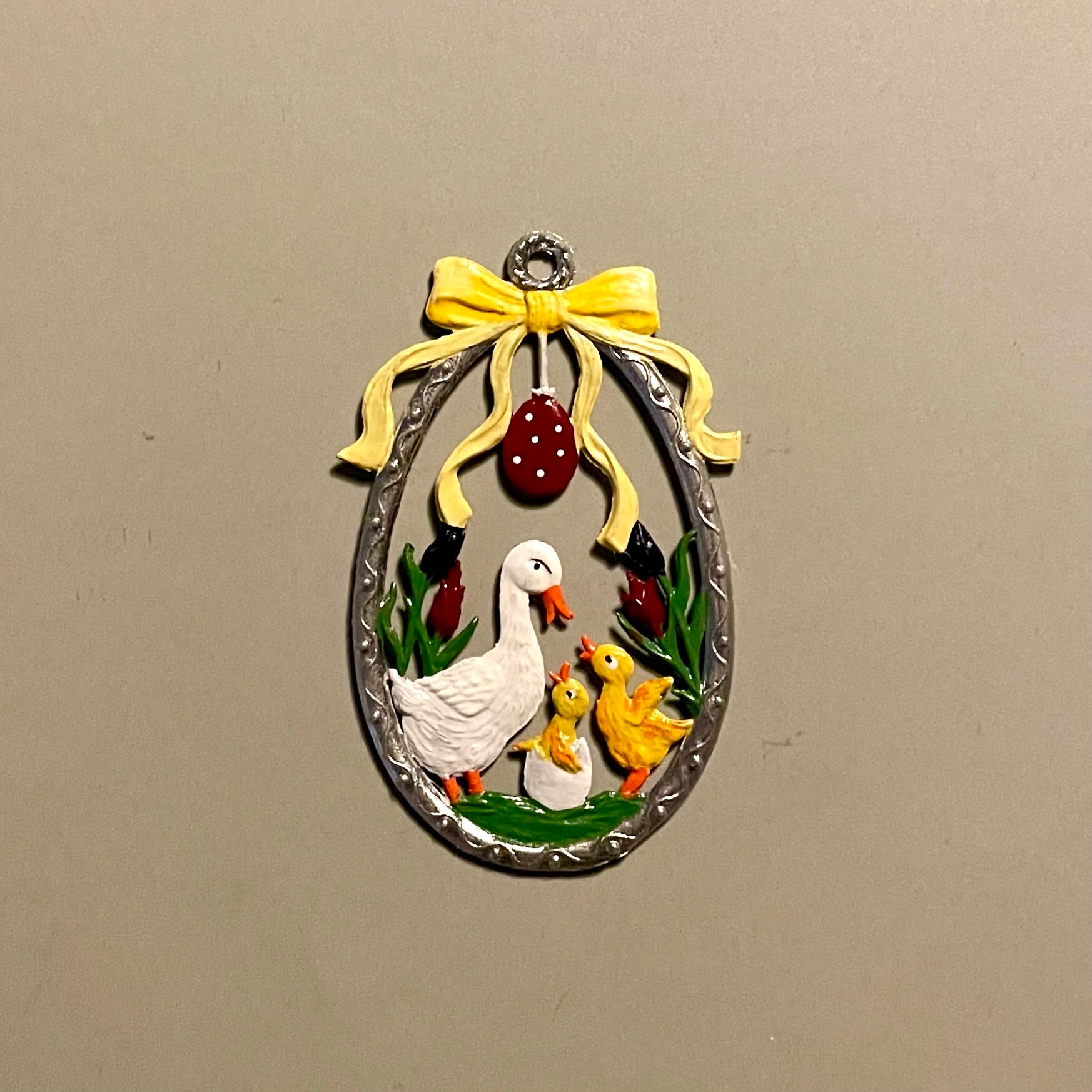 Smukt håndlavet og håndmalet ophæng i tin, formet som en oval æg med en charmerende gås og hendes gæslinger omgivet af fine blomster. Øverst prydes ophænget af en gul sløjfe samt et dekorativt rødt påskeæg, som fuldender det hyggelige påskeudtryk.